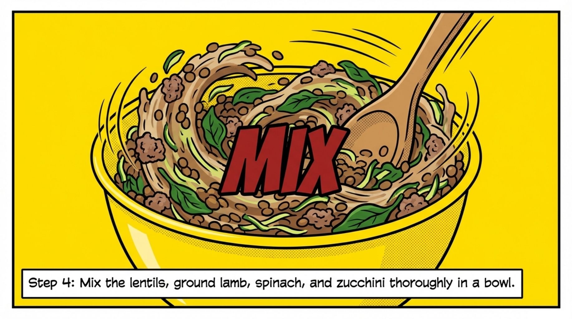- Mix the lentils, ground lamb, spinach, and zucchini thoroughly in a bowl.