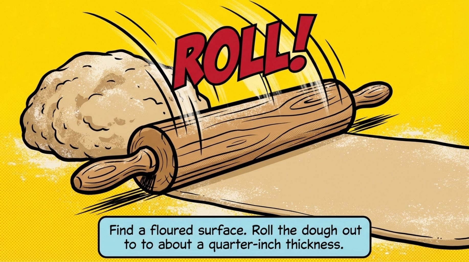 - Once the dough is ready, roll it out on a floured surface to a thickness of about a quarter-inch.